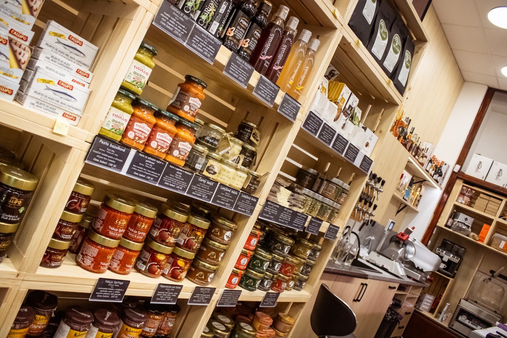se specializuje na italské sýry, krájené uzeniny a vybraná vína, toto vše doplněné pravými italskými těstovinami a omáčkami. Najdete zde také paštiky, sušená rajčata, k vínu pak lehké křupavé tyčinky, sladká tečka v podobě kvalitní čokolády, sušenky nebo piškotu.
